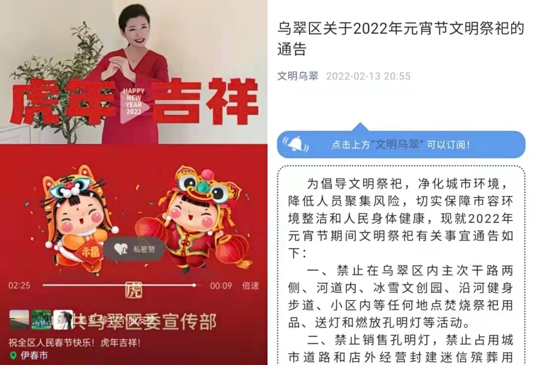 加大宣传,新风倡导传万家。乌翠区坚持把网络阵地作为“除陋习、树新风”活动的重要抓手,多角度、多层次、多形式开展宣传,让文明新风倡导在春节、元宵节期间传遍百姓网络空间。先后利用“文明乌翠”公众号发布《乌翠区“除陋习、树新风”行动倡议书》《乌翠区春节期间文明祭祀倡议书》,通过不断向群众发出倡议,提升群众对文明新风的认知,让大家成为文明过节的实践者和传播者。不仅如此,区委宣传部还通过“文明乌翠”视频号制作发布了《欢乐中国年》MV、全区春节街景视频和春节期间疫情防控工作采访视频,为全区各系统战线发布了拜年视频,向百姓传递了来自党员干部的美好祝愿,用镜头记录了乌翠区社会层面欢度新年、文明过节的百姓形象,用深度采访反映了一线防疫干部坚守岗位、宣传防疫的真实场景。翠峦第三中学还组织了师生在网上过元宵节,通过班级微信群传播传统文化、组织视频猜灯谜、宣传文明过节新风。一系列活动以“软文化”“新形式”营造树立全社会“新风尚”。据统计,在春节、元宵节期间,乌翠区各类文明倡导、节日主题相关转载、报道及视频消息浏览量达到5.4万余次。