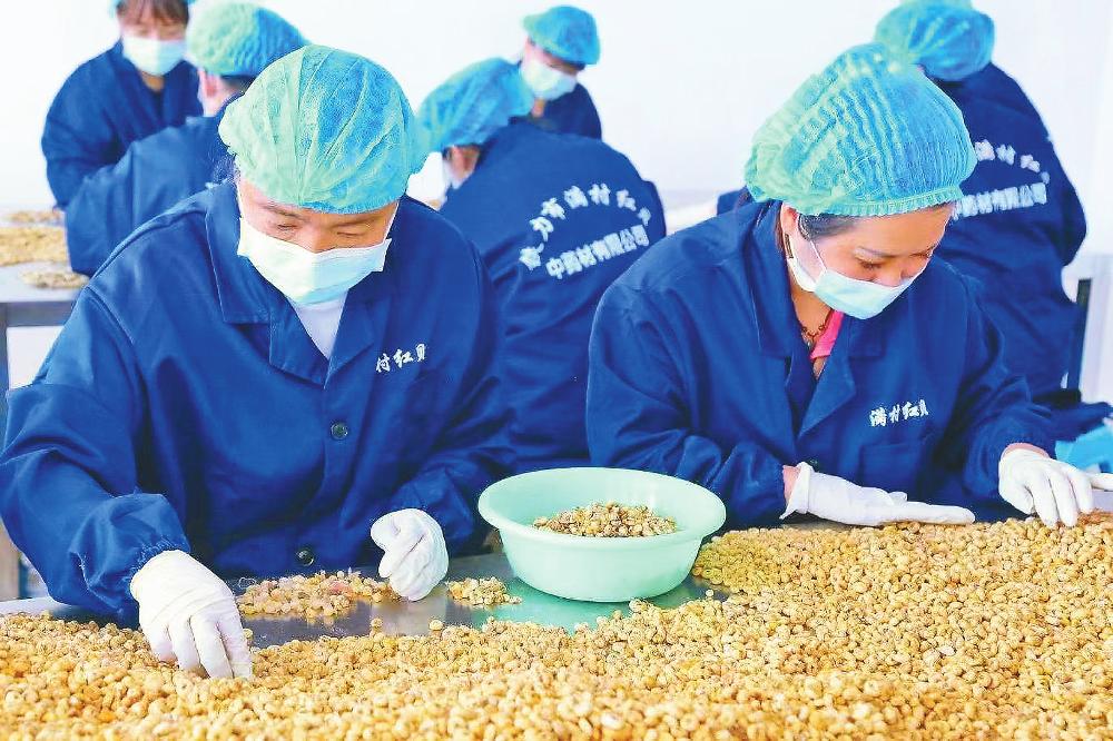铁力市满村红贝中药材经销有限公司的工人们在精选平贝。