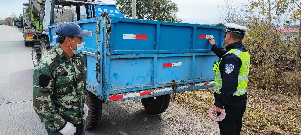 铁力交警为农用车辆、电动车粘贴反光标识,并提示驾驶人注意行车安全。