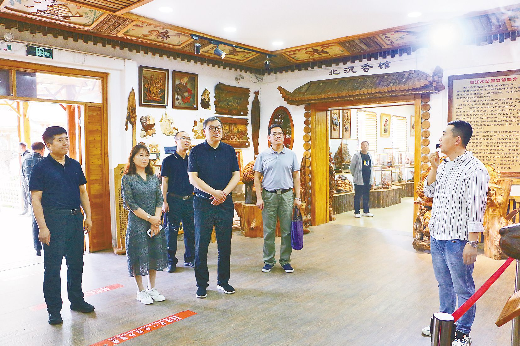 工艺美术大师们在伊春市美江木艺有限公司展厅参观考察。