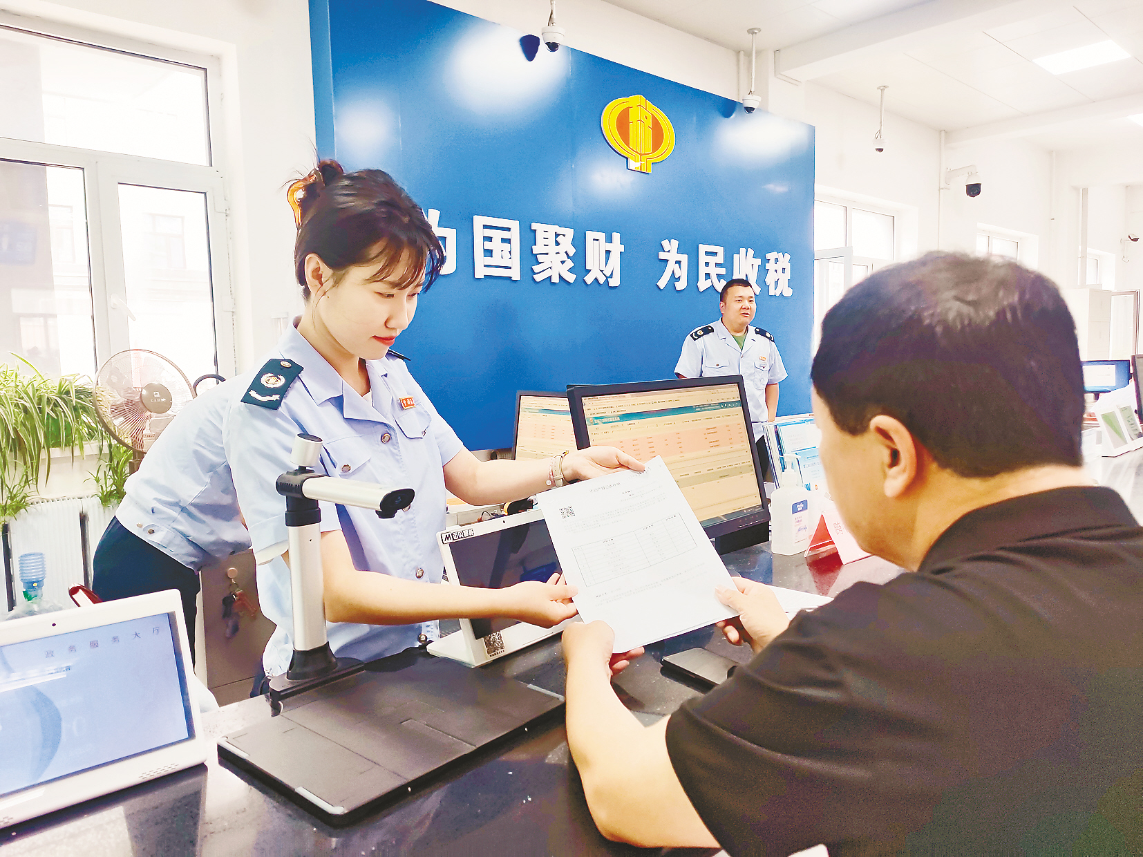 友好区税务局工作人员耐心的向企业负责人解答税法政策。