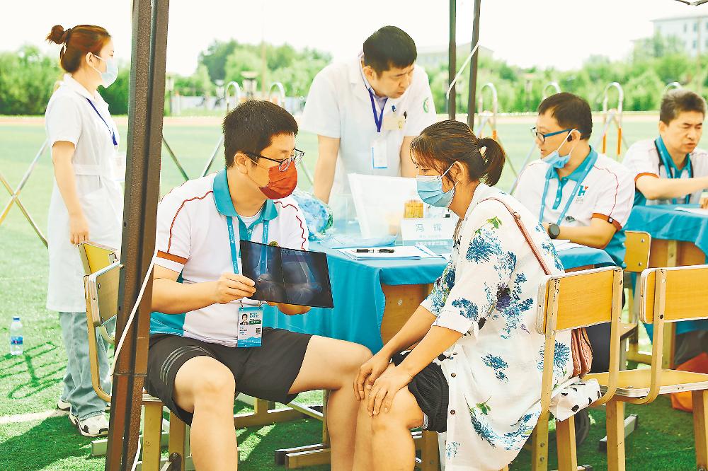 图为北京大学第三医院骨科医生为义诊患者剖析病因。