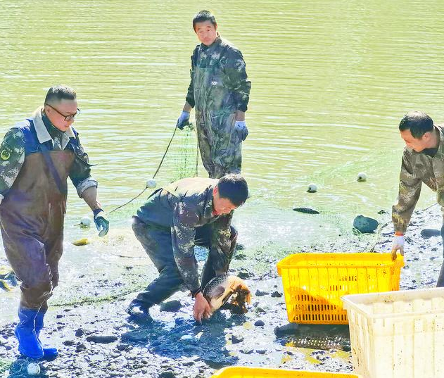 捕鱼的场面十分火热,四五个村民在池边拉网,白花花的大鲤鱼便不情不愿地现了身形。鱼在池边的渔网中奋力跃起,鱼尾拍岸发出“啪!啪!”声。手握抄网的村民们却十分淡定,把抄网伸进渔网里仿佛不经意地一拨,一条活蹦乱跳的大鲤鱼就被捞进了网兜。鱼放进周转箱,攒上五六条,箱子就满了,被两位村民合力抬着上坡上车,举着箱子一斜,鱼就进了运鱼车。