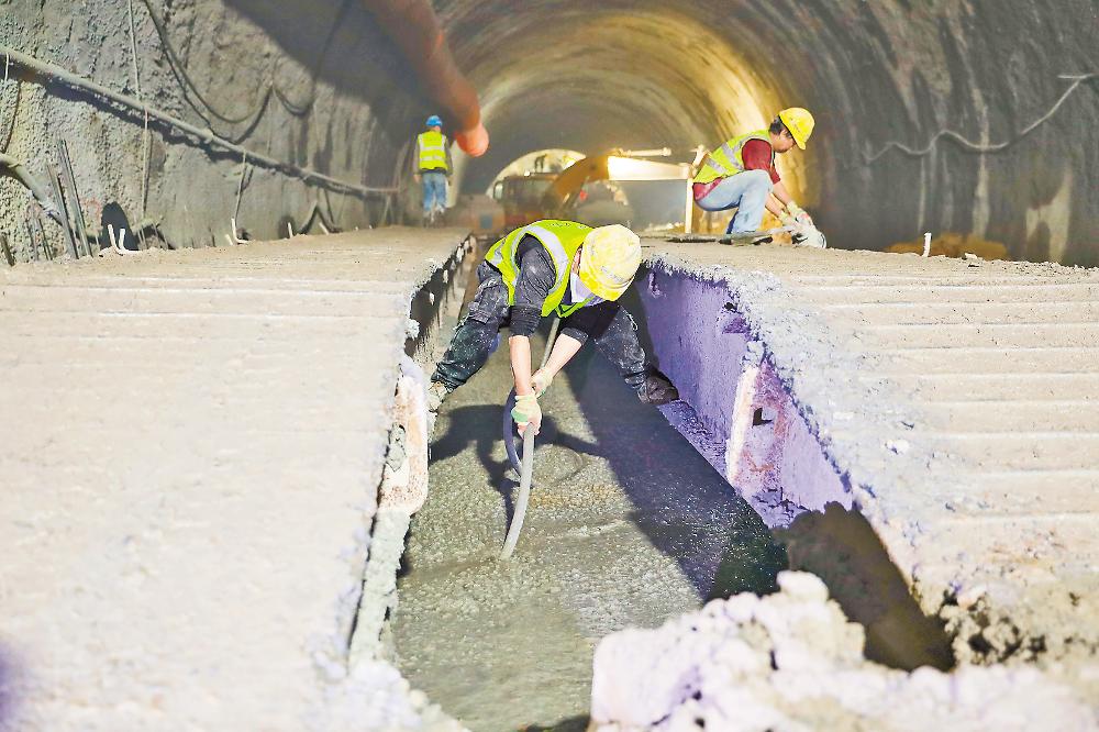 沿隧道深入,不时有清运洞渣的装载机和混凝土运输车往来穿梭。当记者接近隧道最深处,部分工人在进行仰拱回填混凝土振捣施工,一台挖掘机正开挖中心排水沟,隧道施工所用的风水管道已经接通至掌子面。