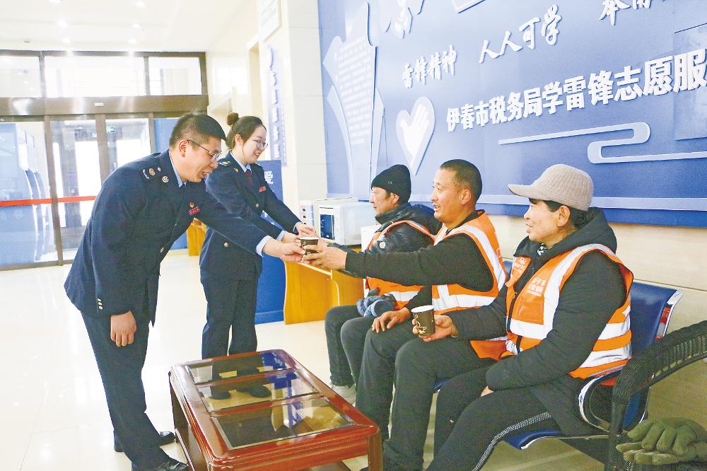 11月16日,市税务局工作人员为在学雷锋志愿服务站取暖的环卫工人送去热水。