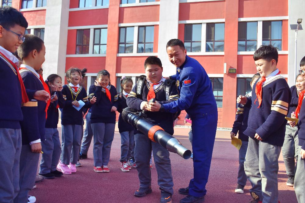 图为艾华岭向学生们讲解风力灭火机的使用方法。