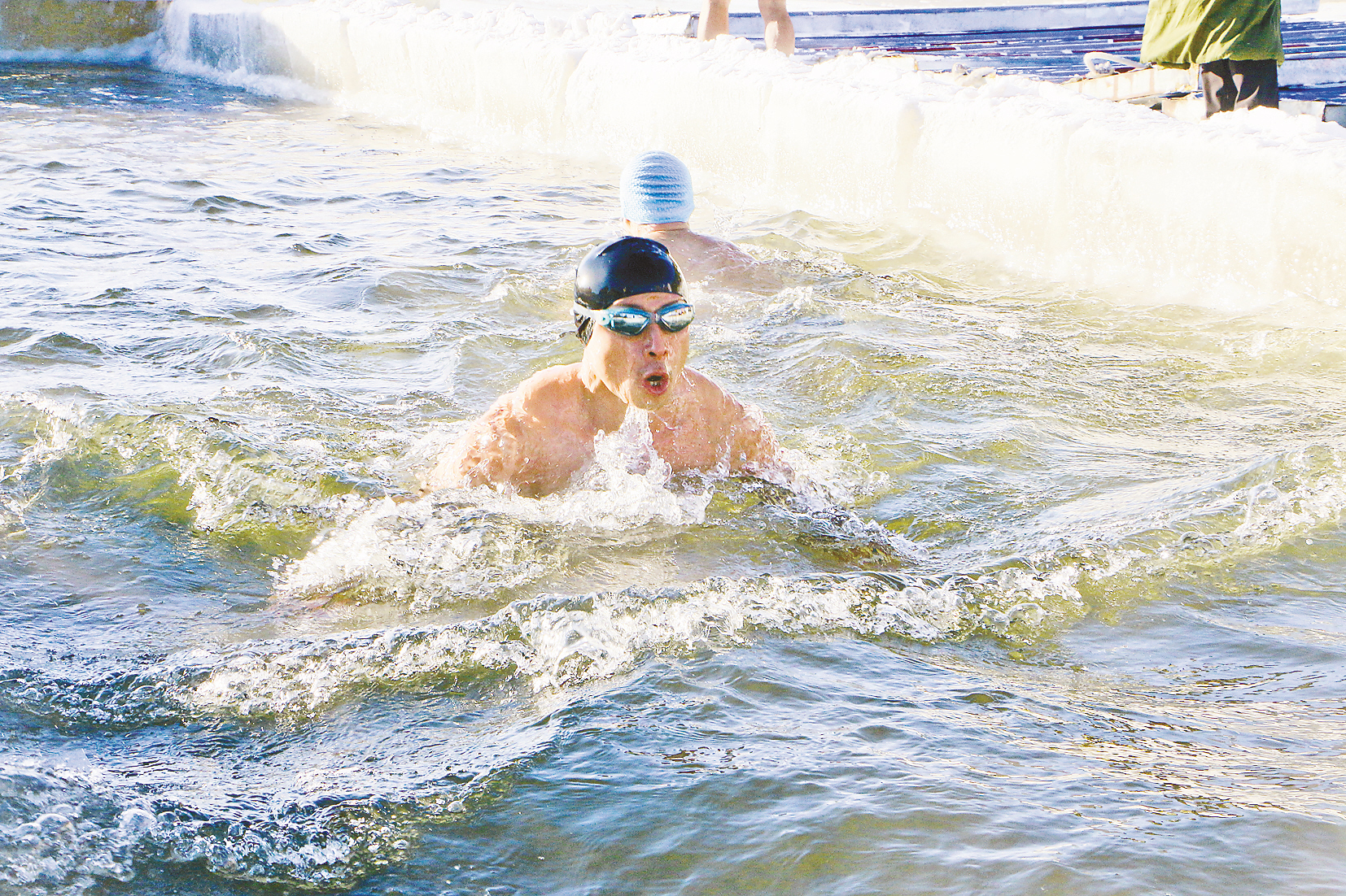 冬泳爱好者不畏严寒,在伊春河中畅游。