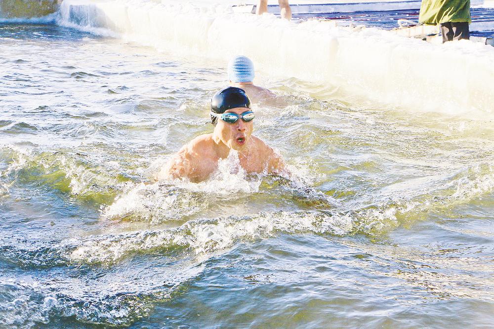 冬泳爱好者赵彦斌对记者说:“我参加冬泳10多年了,冬泳是一项非常好的健身运动,你看我们这些冬泳的人身体多好!”
