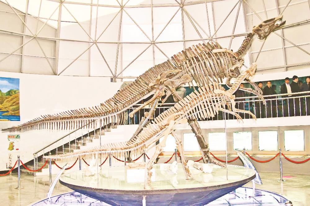 在恐龙博物馆,首先映入眼帘的是一具雄伟壮观的鸭嘴龙化石骨架,它高4.5米、长8米,被誉为“神州第一龙”,紧邻其旁的是真骨率高达80%的鸭嘴龙母子二龙化石骨架,也是该馆的镇馆之宝。它们巍然矗立于展厅之中,以威严的姿态诉说着恐龙时代的辉煌故事。