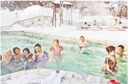游客在冰天雪地中体验温泉。