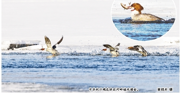 本报讯(记者 赵斌)春江水暖鸭先知。2月23日,我市摄影爱好者黄晓光在汤旺河伊春段火车站至101流域,拍摄到了中华秋沙鸭美丽的身影。