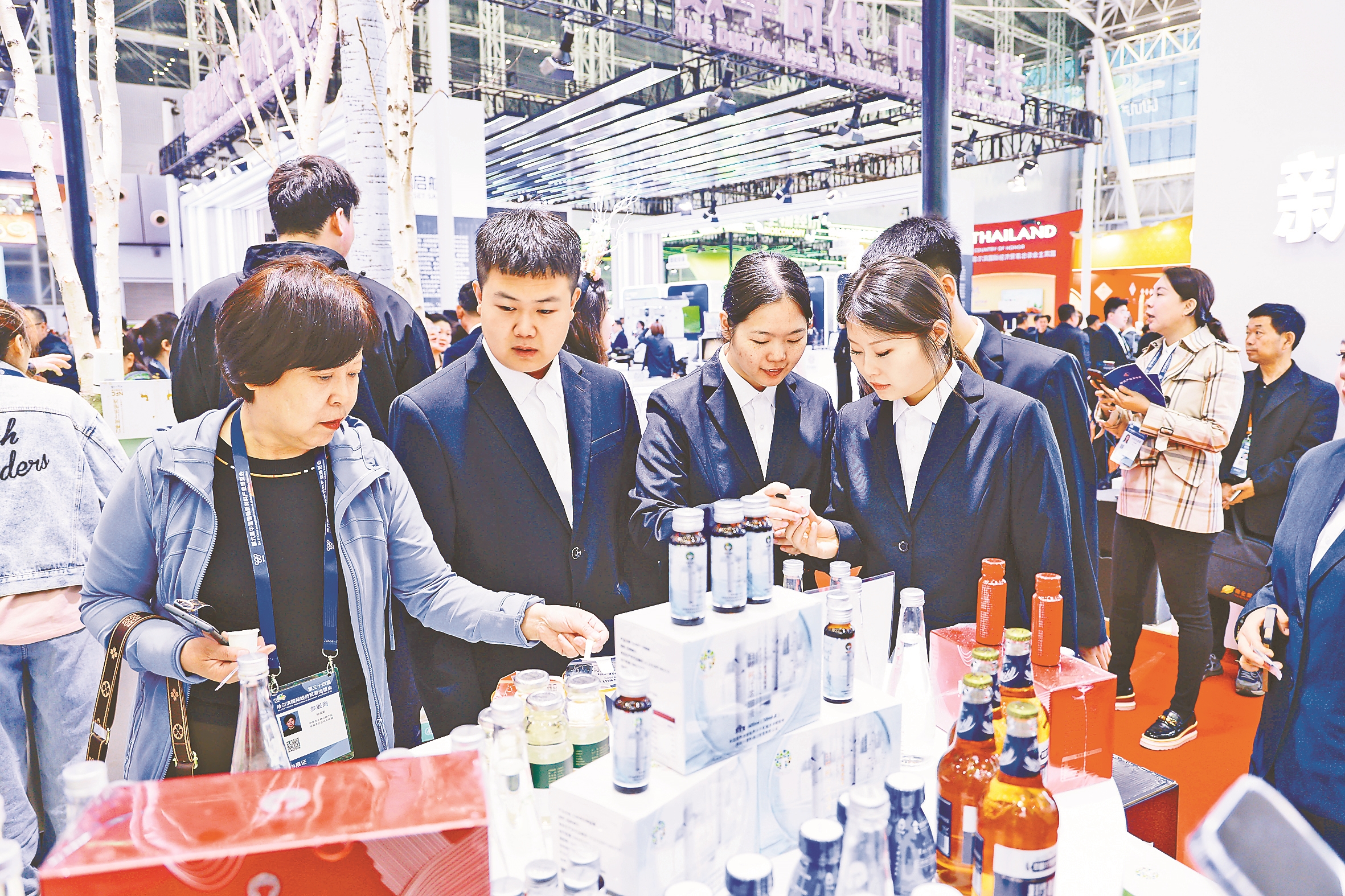 哈洽会上,伊春展区内琳琅满目的桦树汁产品吸引了宾客的目光。