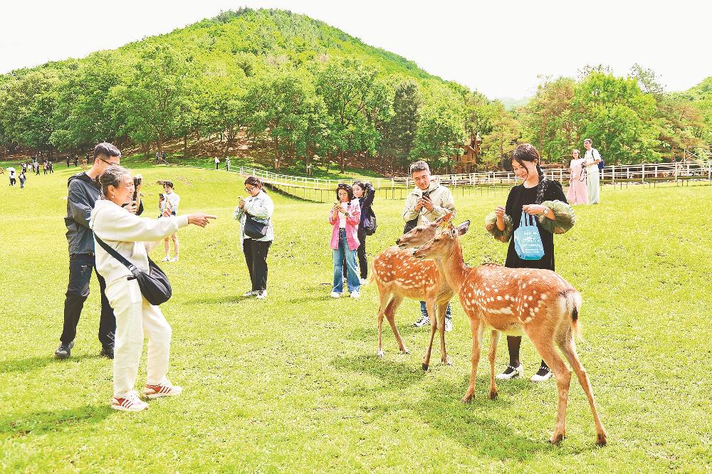 金山鹿苑凭借其独特的自然风光和与鹿群亲密互动的特色体验,成为旅游热门打卡地。图为游客与小鹿互动。