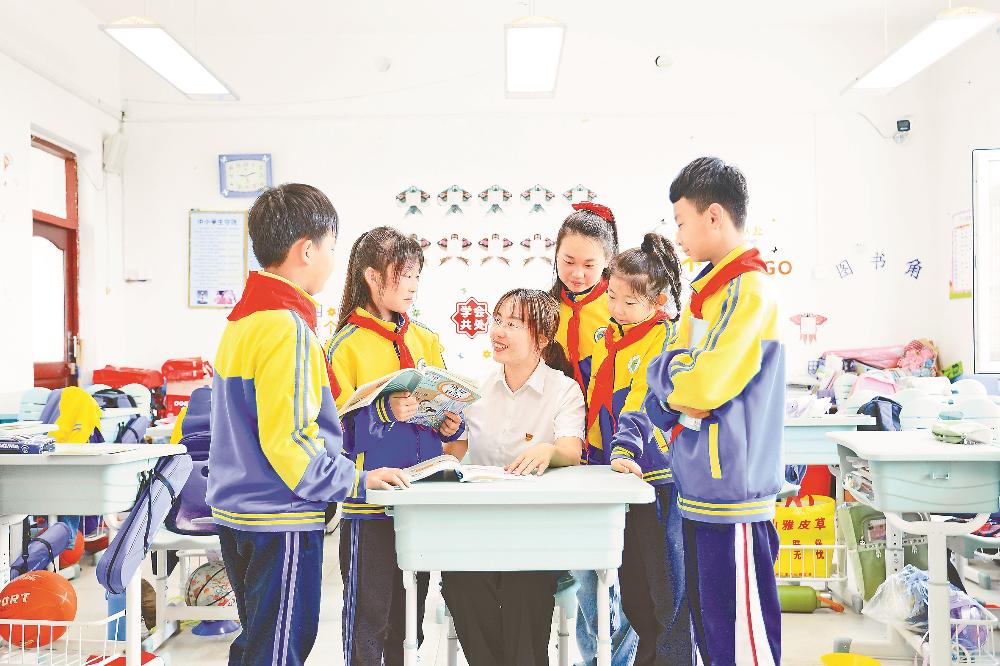 图为友好区第二小学教师尹海荣正在利用课下时间为学生们进行学习辅导。
